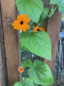 Perhaps my favourite this year has been black eyed Susan, Thunbergia alata. This is a half hardy annual native to east Africa, and it has grown well for me. It enjoys a little shelter and doesn’t like winds, and my garden is pretty sheltered. It also loves sun, which I haven’t been able to provide so much of this year but it has started flowering for me anyway. The flowers are really unusual, an oddly ‘flat’ sort of orange with a deepest black centre, and really the whole flower looks as if it has been painted by a toddler, or has popped out of the pages of a comic. Now that it has started to flower in profusion it is really striking in the garden, and really draws the eye.