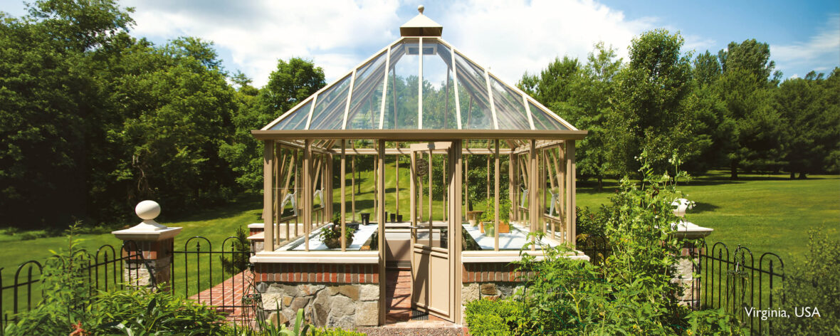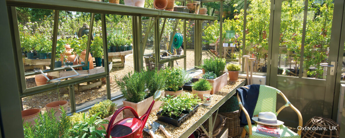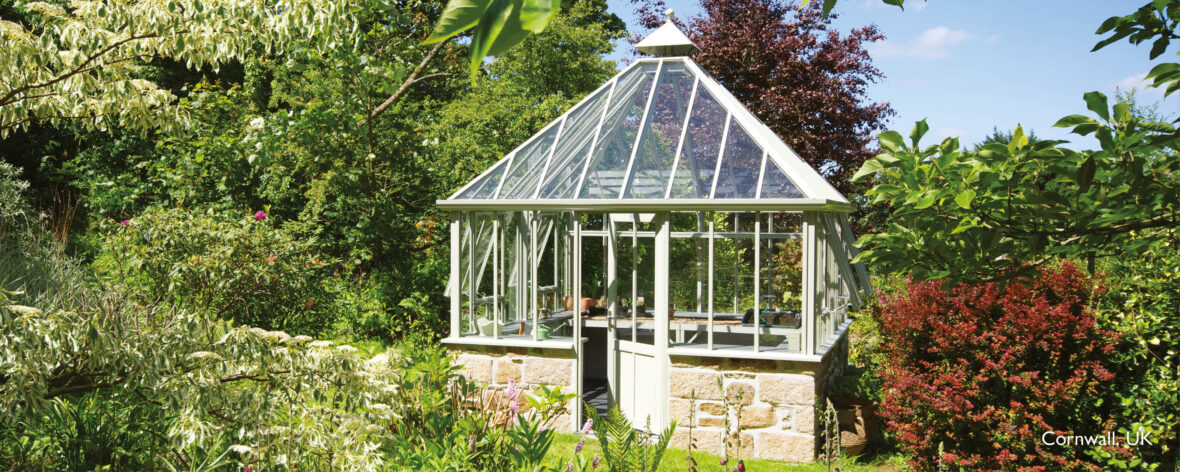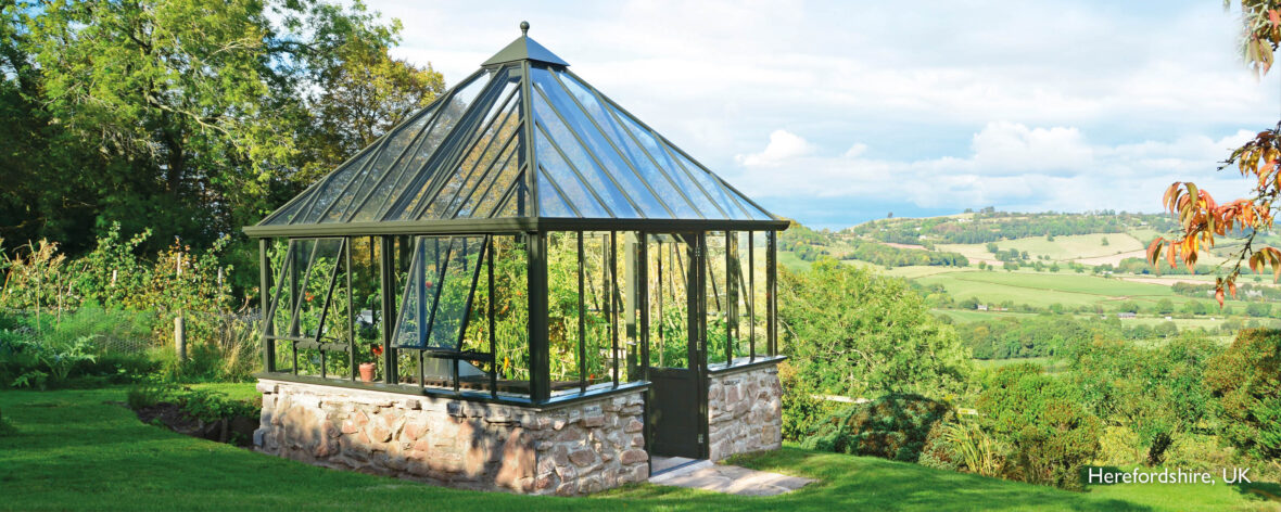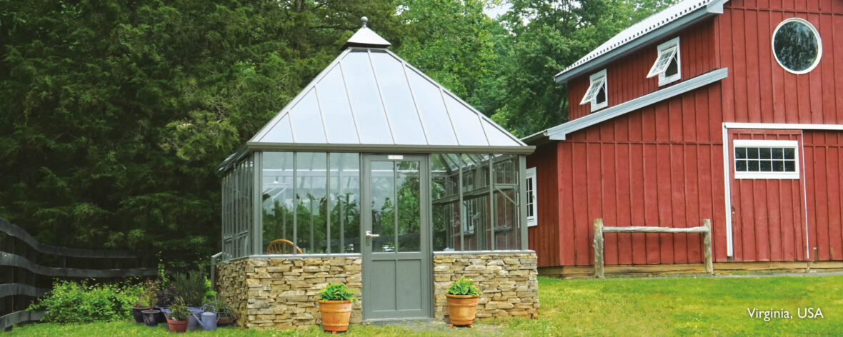 The Grange is an unusual, stylish and practical square glasshouse with a high four-sided pyramid roof rising to an attractive apex. This structure is available in a wide choice of colours and has four large side vents and seemingly endless panes of 4mm toughened safety glass. Clean, uncluttered lines make for an exceptionally spacious interior which will accommodate deep staging on three sides.